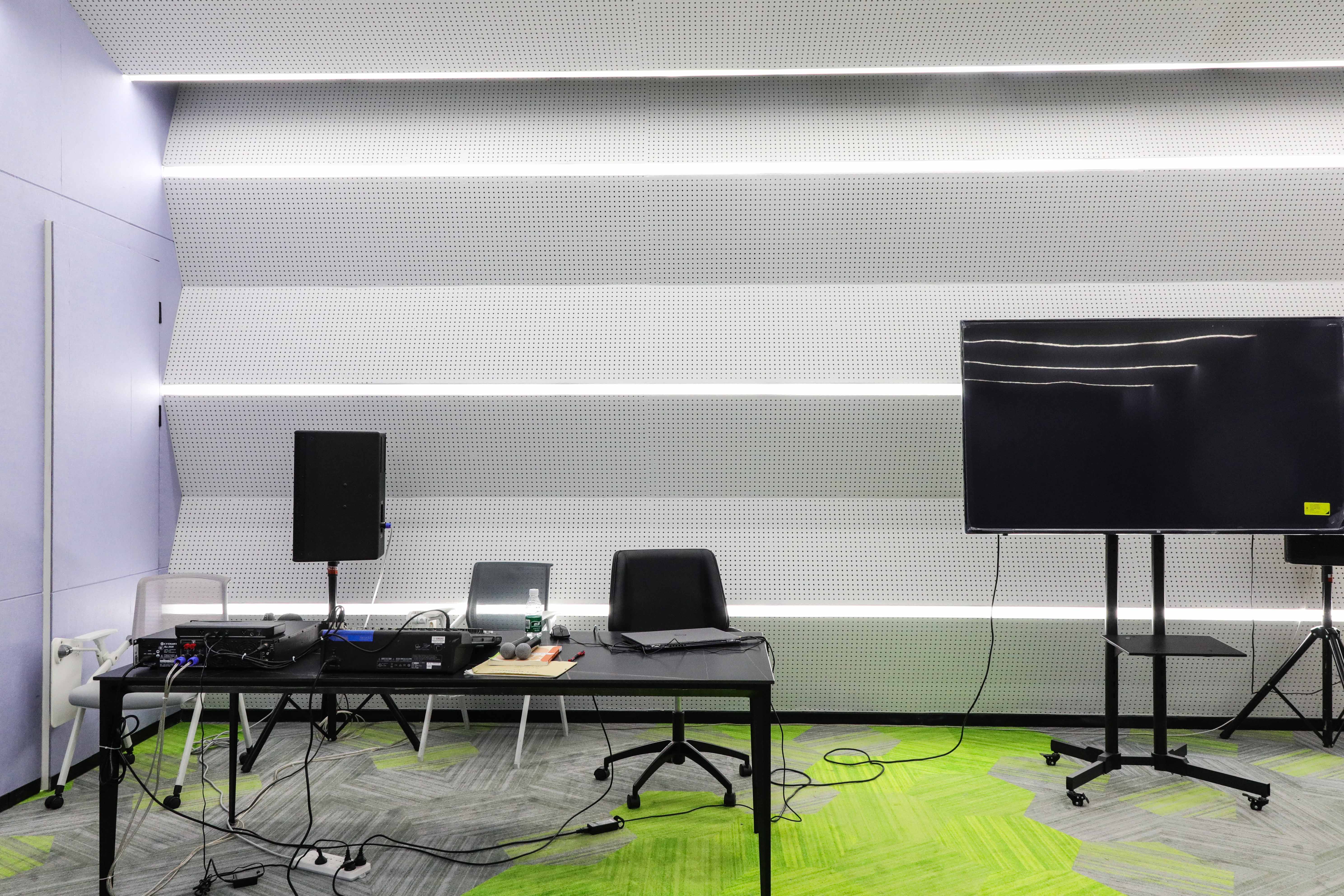 硬件配置:计算机、交互式智能平板、雅马哈调音台、雅马哈功率放大器、舒尔无线麦克风等。